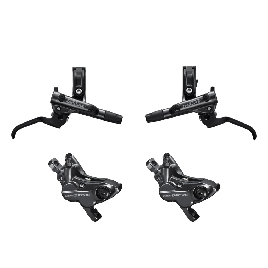 • Shimano Deore BR-M6120 4-Piston Disc Brakes, BR-M6120 4-piston callipers and BL-M6100 levers, full set (front & rear). Brakes are assembled with hoses and pre-bled & include Shimano D03S resin brake pads.
